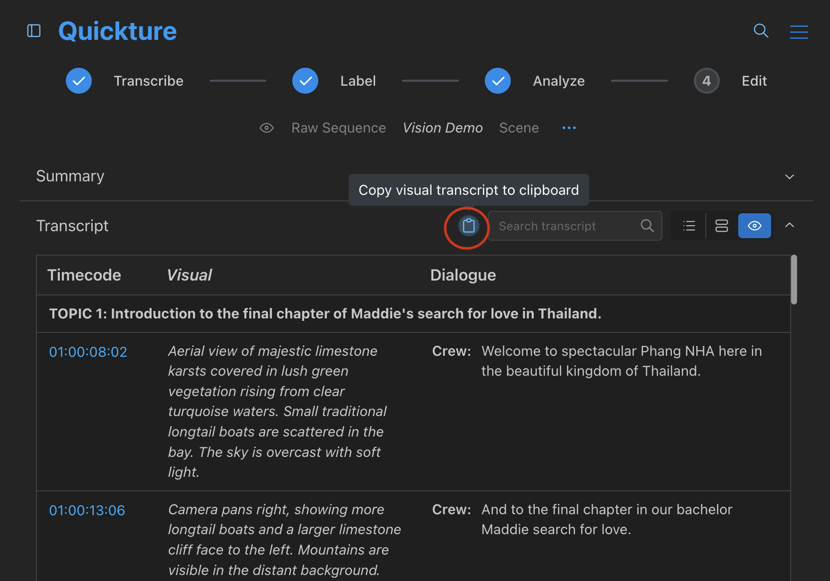 Jokaiseen sekvenssiin Quickture luo erittäin yksityiskohtaisen visuaalisen transkription kaikesta, mitä ruudulla näkyy, perinteisessä kolmen sarakkeen muodossa, kirjaten aikakoodin, visuaaliset kuvaukset ja dialogin.