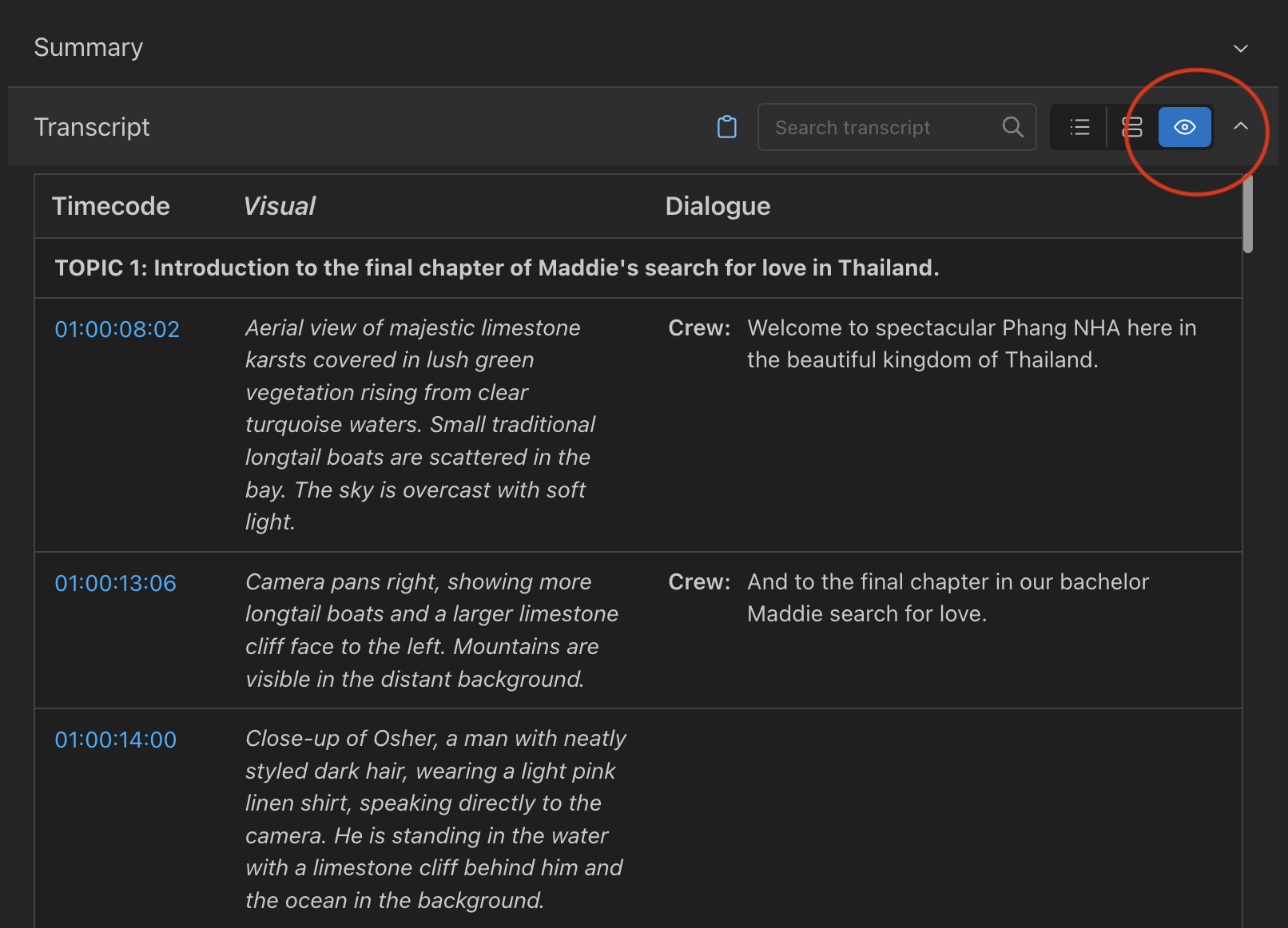 Voit helposti hakea Vision Transcriptista suoraan, sekä visuaalista sisältöä että dialogia, ja valikossa > Transcript Preferences voit valita, vietkö Vision Transcriptin Word-, Excel- tai Teksti-versioina.