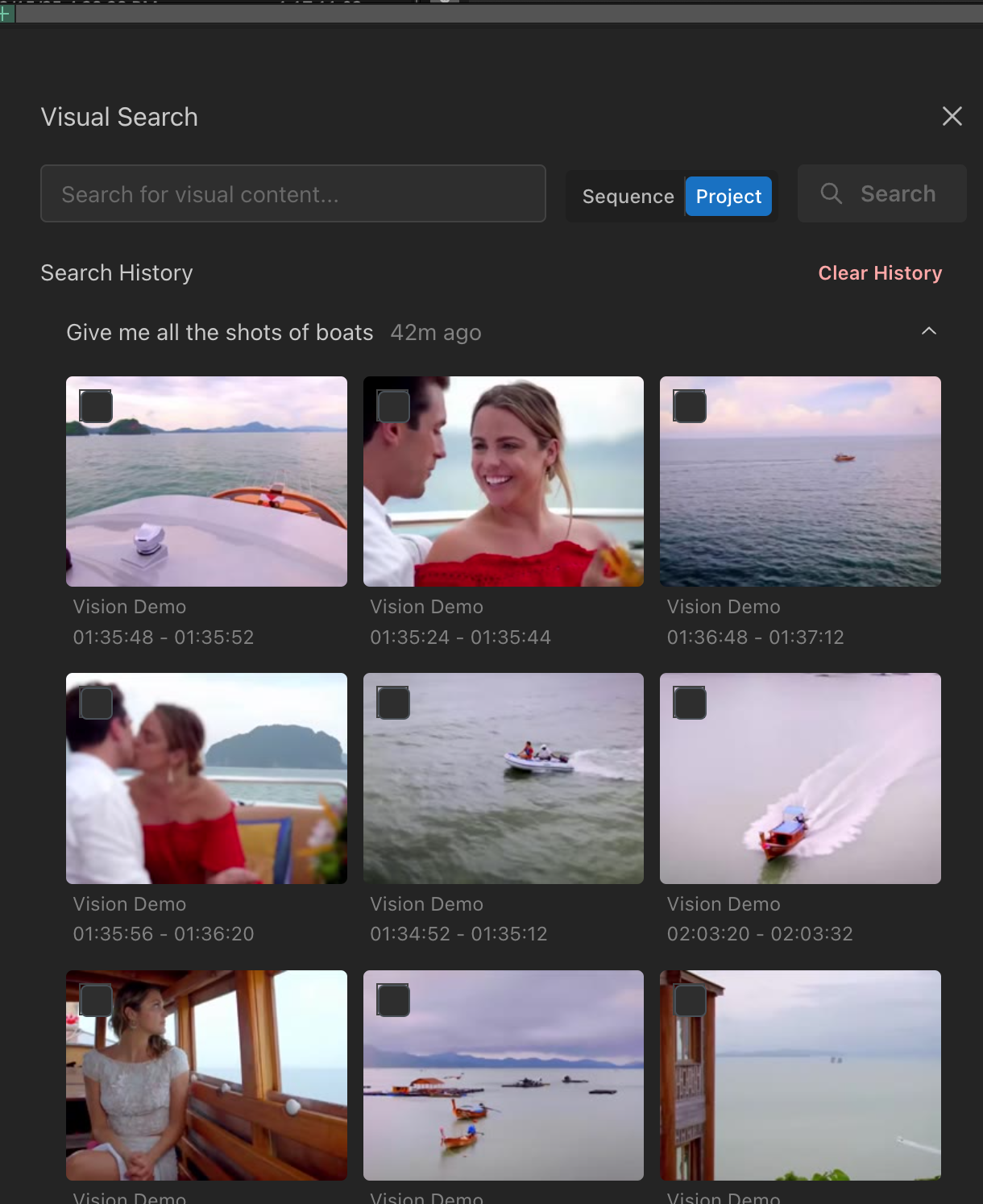 Pieni suurennuslasikuvake Quickture-paneelisi oikeassa yläkulmassa avaa Vision Search -palkin. Kirjoita mitä vaan, yksittäisistä sanoista (autot) tarkkoihin kuvauksiin (mies kävelee vasemmalta oikealle ruudulla musta cowboy-hattu päässä). Quickture löytää sen, oli se sitten yksittäisessä sekvenssissä tai koko projektissa!