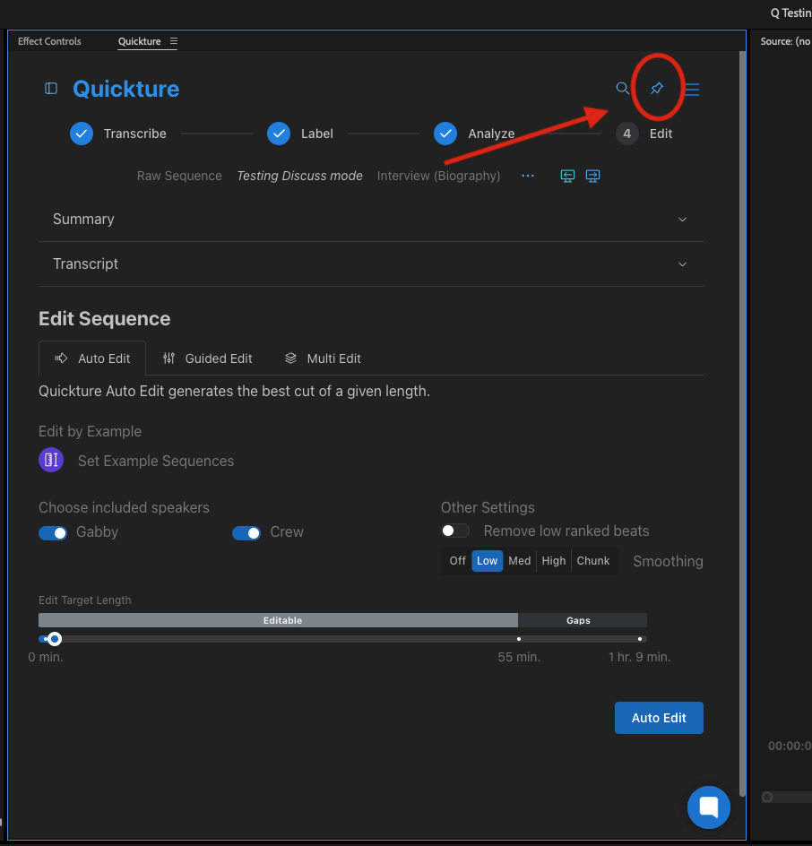 The new Pin Panel feature lets you lock the Quickture panel to a specific sequence, so it doesn’t automatically switch when you change sequences in your project. This is perfect for reviewing transcripts, comparing edits, or referencing notes while navigating elsewhere in your timeline or bins.